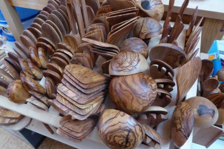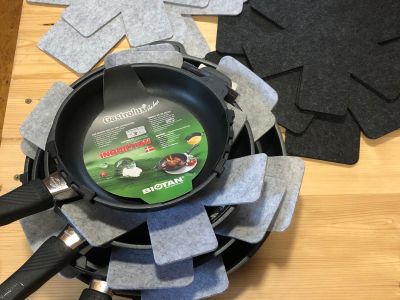 Für die Essenszubereitung: Messer oder Spiralschneider für das Zerkleinern von Gemüse, Schneidebretter, Gemüseschäler, Hobel, Kochlöffel in verschiedenen Holzarten, Pfannenwender, Pfannen von Gastrolux, Eisenpfannen von Turk, …