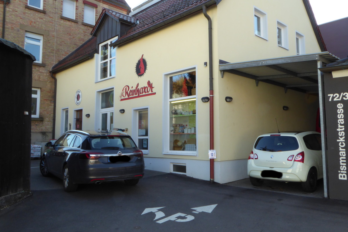 Direkt vor unserem Geschäft stehen Euch zwei Parkplätze zur Verfügung. Einer parallel zur Hausfront (siehe Markierung) und einer im Carport hinter unserem roten Bussle.