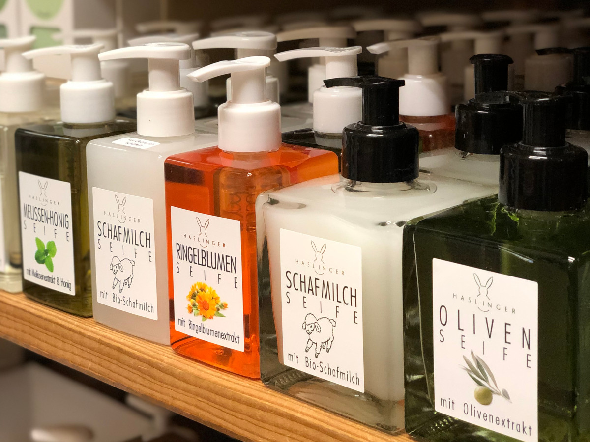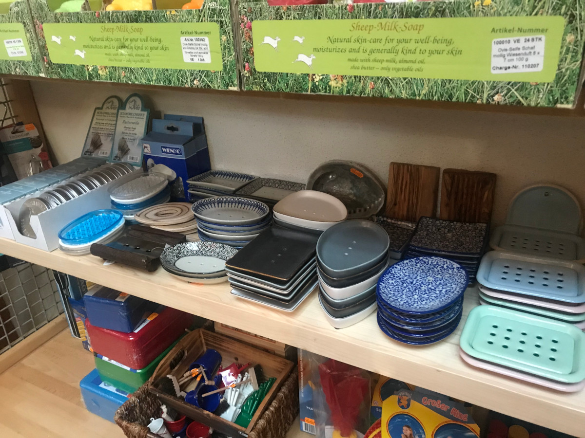 Unsere komplette Auswahl an Schafmilchseifen findet Ihr an der Treppe auf dem Weg ins Obergeschoss. Auf dem Bild steht Ihr inmitten unseres kleinen Schafmilchseifenparadieses. Kein Wunder, dass da der ein oder andere beim Hochlaufen hängen bleibt. Stöbert aber am besten durch den ganzen Laden, es lohnt sich.