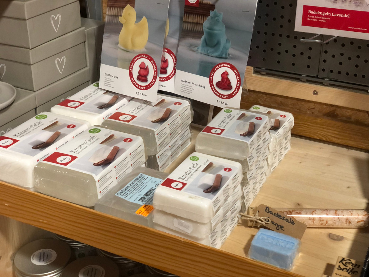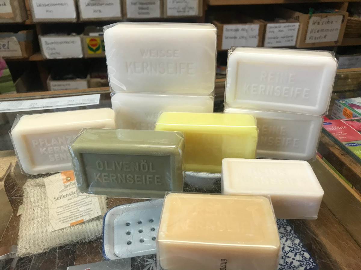 Der Klassiker unter den Seifen, ist definitiv Kernseife. Aber nicht nur reine Kernseife bekommt ihr bei uns, genauso liegen unparfümierte Kernseife, große Kernseife, Olivenöl-Kernseife, Zitronen-Kernseife und Pflanzenölkernseife voll im Trend. Ihr findet sie in den Kisten direkt im Eingangsbereich.