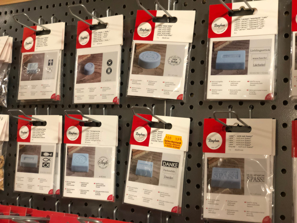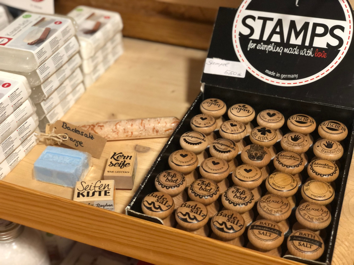 Hier könnt Ihr mit dem Stempel noch passende Anhänger mit Aufdrucken wie "Badesalz" oder "selbstgemacht" basteln.