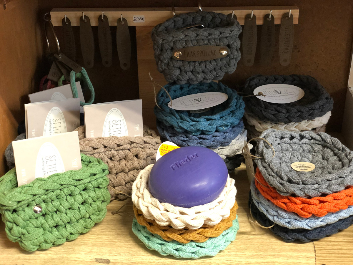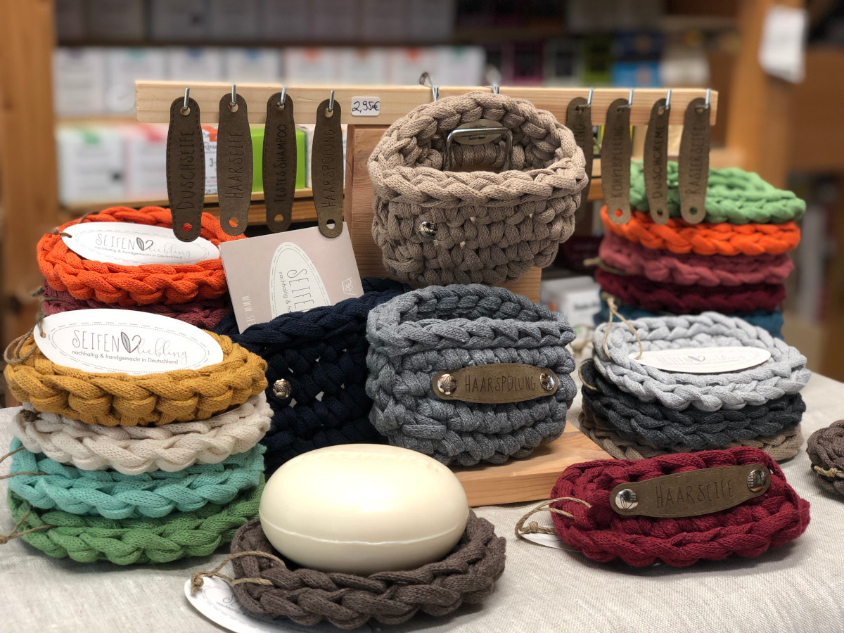 Seit 2022 haben wir noch eine komplett neue Variante an Seifenablage für Euch ins Sortiment aufgenommen. In Handarbeit gestrickte Seifenablagen aus der Eifel. Der Seifenliebling besteht dabei zu 80% aus Baumwolle (Recyclingfaser) und zu 20% aus polyesterrecycelten Baumwollfasern. Nicht nur Seifenablagen, sondern auch Seifenkörbchen für die Dusche gibt es aus diesem Material. Damit man weiß, welche Seife welche ist, gibt es hier auch die Möglichkeit eine Beschriftung anzubringen. Die Seifenlieblinge sind bei 30 Grad waschbar. Ansonsten kann man sie aber auch wunderbar mit Wasser auswaschen, trocknen lassen und dann sind sie schon wieder einsatzbereit. Es gibt eine unglaublich tolle Farbauswahl, wie Ihr auf dem Bild sehen könnt. Ein Musterring hängt auch im Laden, gerne bestellen wir Euch eure Lieblingsfarbe in der gewünschten Ausführung, falls diese nicht vorrätig sein sollte.